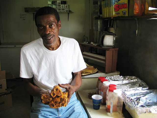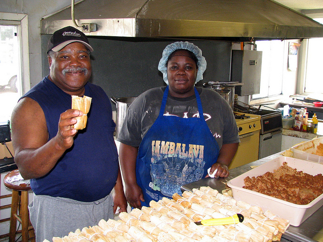 Within the Delta, the city of Greenville is a hotbed of hot tamales. In the early part of the twentieth century, river commerce drew many Sicilians to the area. It’s possible that migrant Mexican laborers who came through the Delta might have shared their tamale tradition with these Italian immigrants. Delta tamales may have developed from the African American dish called cush. Lumumba Ajanaku, a tamale vendor in Yazoo City, talks about cush in his interview: “Some say [hot tamales] come from an old word that we use called cush, you know. A lot of the Africans would just take meal and season the meal…because a lot of them didn’t have enough money to buy meat like they wanted, so they would take the meal and season the meal. And the meal would taste so good it tasted like meat was in it.”