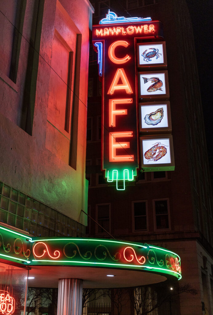 I grew up going to the Mayflower, too. I remember the neon sign that flanked the building at the intersection of Capitol and Roach streets and lit the corner in an orange-and-green glow. I remember the chalkboard that leaned against the front window, advertising soft-shell crab and fresh Gulf snapper. I remember walking outside the restaurant, around the building, and up a flight of stairs to get to the dim bathroom—a quirk that regulars accepted as part of the experience. I learned to slather comeback sauce on yeast rolls. On the way out, I would beg my parents for one of the mint chocolate candies that sat near the cash register. Even after we moved, the Mayflower remained a staple in our community, a place to keep going downtown for, year after year, even as downtown continued to hollow out and suburban Jacksonians warned each other about its supposed dangers.
