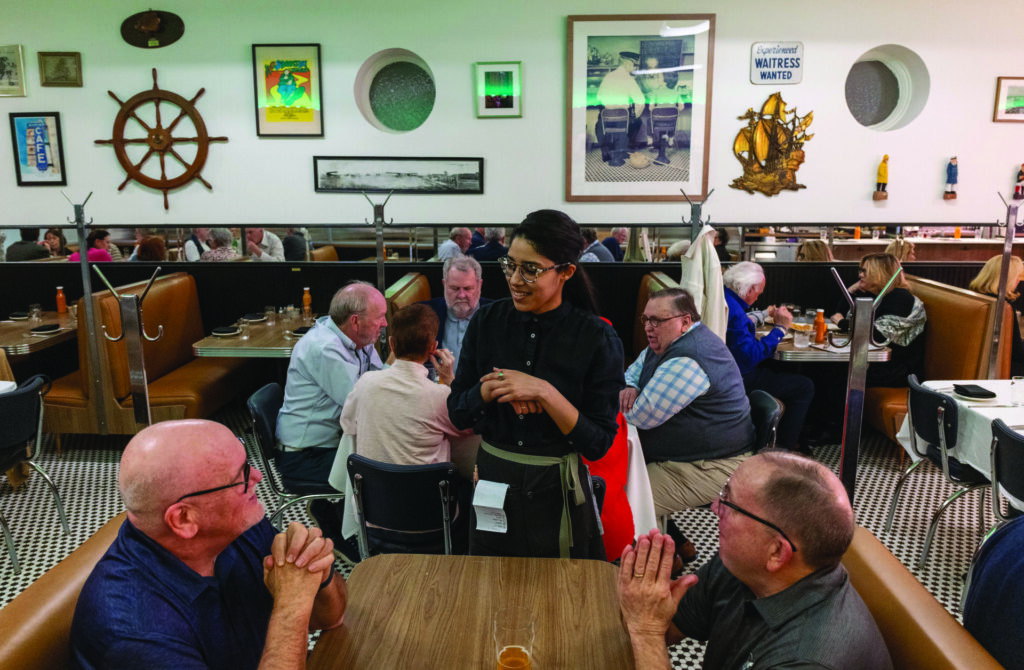 Tricia Sanders is one of the staff members who stayed through the ownership transition. She started serving at the Mayflower eighteen years ago, somewhat reluctantly. “I remember thinking, I don’t think I’ll make money here,” she laughs, recalling the restaurant’s humble atmosphere. “I made a lot of money here.” Friday nights brought reliable business, and a lunch rush might see two or three seatings. That was before the pandemic, though, and traffic slowed in subsequent years. Still, “we made it through,” Sanders says. Countless neighboring restaurants weren’t so lucky.
