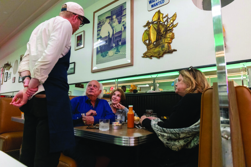 Yes, the new Mayflower would look different, but primarily in ways that hearken back to the restaurant’s history. The new owners took the ceilings back up to their original height and installed an oyster bar where Jerry’s father, Mike Kountouris, used to ice his fish. A cocktail program and Greek-inspired wine list overthrew a longstanding BYOB policy. Artwork that pictures regulars’ families has stayed. They renovated the sign outside, which still glows neon. Abbreviated menus feature a new logo inspired by a matchbook Evans and McCain found upstairs in the building, likely from the 1950s or ’60s. An online system facilitates reservations for all. Also, Evans says, “We’re not going to mess with the salad dressing.” Crucially, they invited all of the staff members to stay through the transition, and most agreed.