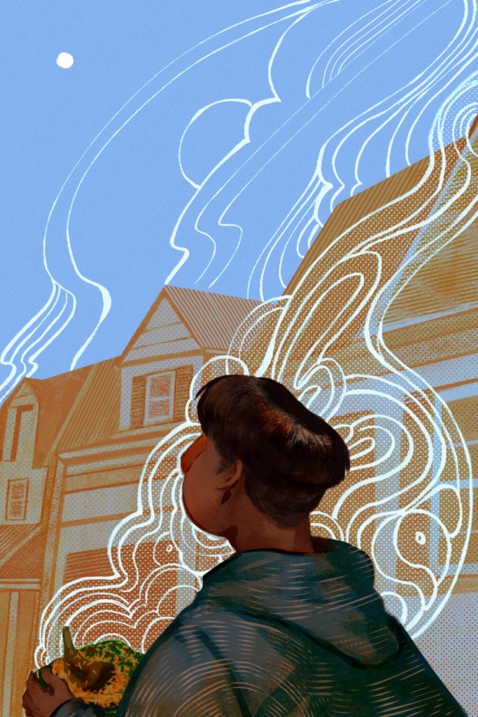 Dinner was ready. Platters overflowed with kebabs and pulao. Alongside stood a steel bowl of kachumber—sliced tomatoes, onions, green chiles, and cilantro with salt. I’d pour the juice that collected at the bottom of the bowl over everything, especially the Parker’s corn sticks that Nihal Uncle never failed to bring. We ate with our hands, getting sticky and smoky. Us kids sat on the floor near our parents and drank Coke with ice, stealing sips of their chai. We discussed Ghostbusters and giggled about when our parents would stop referring to home plate as “home base.” They talked about work and the upcoming presidential election. Ours were the voices of a growing community, filled with killings and pickings and religious entanglements, mixing like rising smoke.