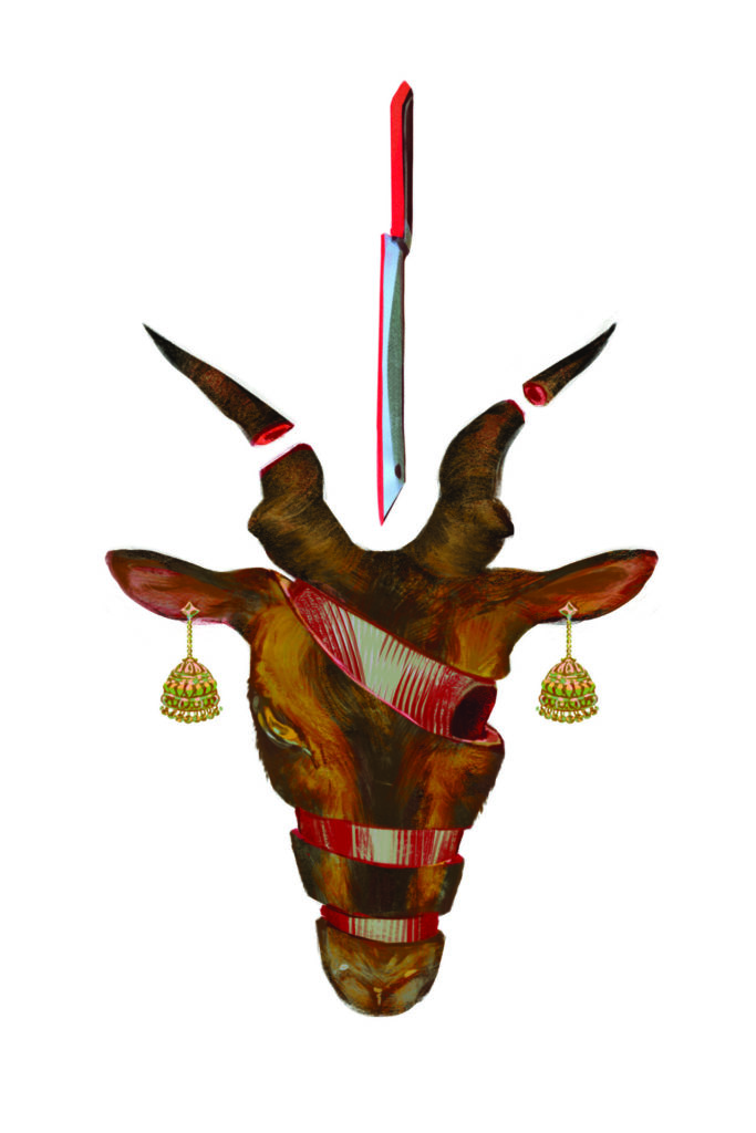 Our house sat on a corner lot. The driveway was big enough that we could practice our second-grade dashes from home plate to second base, or play cricket or half-court basketball. On this day, we parked on the street instead. The driveway sat empty and vast, almost foreboding. My little brother and I each grabbed a rope and gently lifted Earl and James Worthy from the trunk. We trotted them toward the house. Nihal Uncle was already there. Two goatless men arrived with a tarp and a black bag filled with knives and rope. My dad hauled out a weathered oak stump that they’d later use as a butcher block. We took the goats into the backyard to show them our swing set. Meanwhile the uncles set up the tarp and knives in our garage. They called us over and did a short prayer. I’d like to say “then it hit us.” But it didn’t.