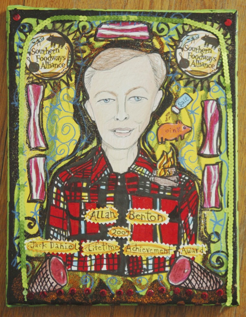 In recognition of Allan Benton’s commitment to the artisanal production of country ham and bacon, and the humble, caring character he exhibits through his business, the Southern Foodways Alliance is proud to present Allan with the 2007 Jack Daniel Lifetime Achievement Award, represented by this painting, by Blair Hobbs of Oxford.