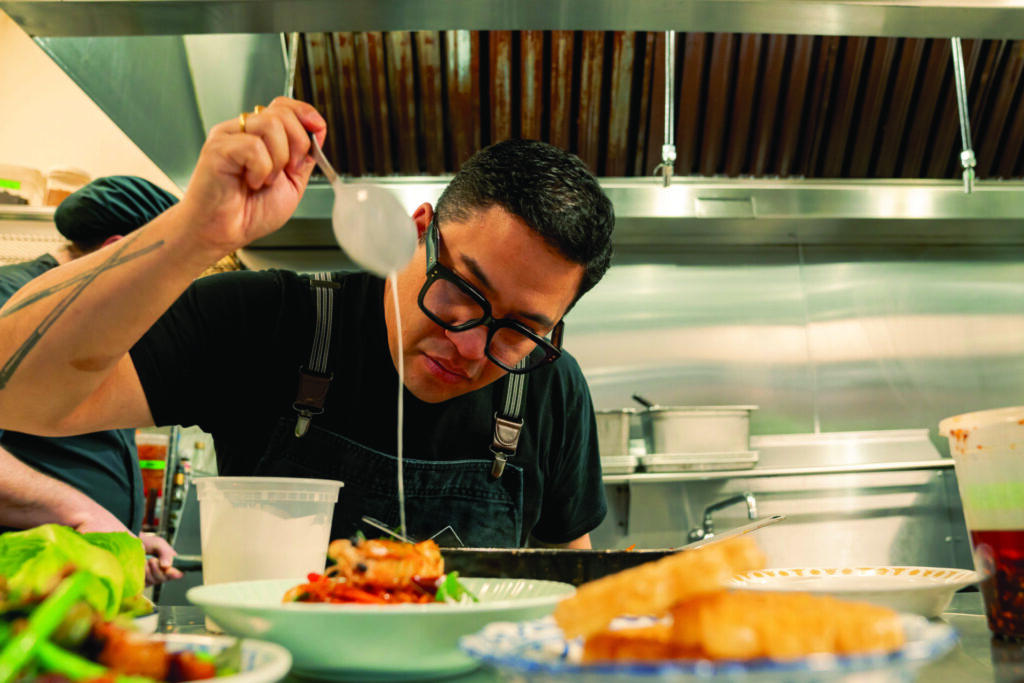 In the dining room, soft pop music purrs beneath hushed conversation. The kitchen smells like fish sauce and sweat. Most of the action takes place at three woks, lined up across the room from a mise en place. If you aren’t used to it, the cloud of spices makes your eyes water. Bearded chefs in beanies and charcoal-colored aprons execute orders, tossing noodles in the woks with tongs. One of them sips a paper cup of coffee from Circle K.
