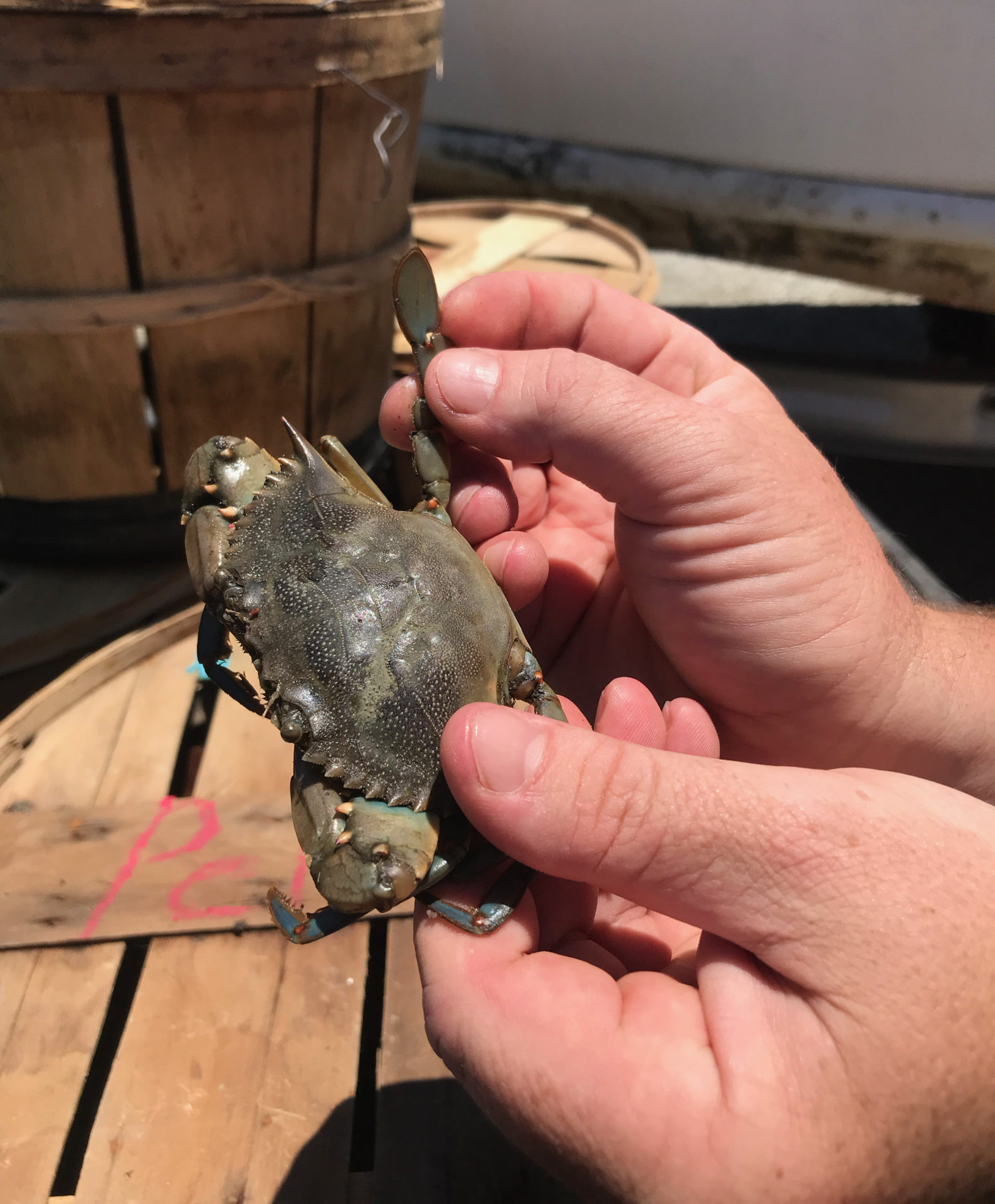 H. M. tutors me on the Eastern Shore of Virginia crab lexicon. Cleaning spot in the cool interior of the oyster house after a summer dawn of gill-netting on Nassawadox Creek, we listen to radio news reports of the rarity of a tornado that hammered the shoreline just to our south a week earlier. H. M. lays out the crab basics that others will embroider in conversations to come. He begins, “You got the he-crab, the he-peeler, then you got the jimmy. Number one jimmies are five and a half up. Then number twos, they’re five to five and a half for the jimmy.” In the progression, H. M. provides, a he-crab is an immature male, and the mature males, jimmies, are classified by size for market. Andrew amplifies this point, “Males, they’re called jimmies. They grade them out different sizes. You have your number ones, which are five and a half and up. You have your jumbos, which are six inches and up. Your number twos, which are five- to five-and-a-half-inch crabs.”