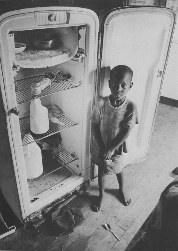 That statement sets the tone not only for Robert Coles’ text, but also for Clayton’s photographs. Yes, the shacks he photographs do signal to readers that the topic of this book is poverty. But it’s not until more than twenty pages into the book that an image reveals how hunger is entangled with poverty. Clayton captured an open refrigerator perched on a wooden floor, and its contents include little that looks edible, with the exception of a jar of baby food and pieces of what looks like crookneck squash. A young child stands in front of the door, a spoon lying near his bare feet. He looks directly at the camera. The photograph feels organic in its composition rather than intentional.