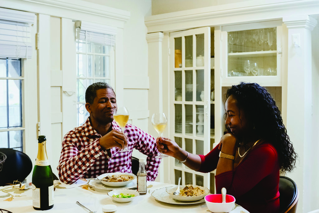 Lolis and Béa enjoy bowls of okra gumbo and toast each other with sparkling wine.