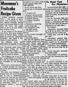 The Natick laboratory fruitcake recipe was sourced from the article “Moonmen’s Fruitcake Recipe Given,” from the Gettysburg Times, December 16, 1972.