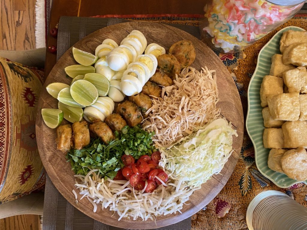 Top photo: Koes Saparsiah, Endang Hadiputro, Veronica Liu, and Xenia Tomobokan at Endang’s home in Houston, Texas. Below: An assortment of Indonesian food and snacks, including boiled and sliced eggs, vegetables, potato fritters, and tahu goreng (fried tofu).