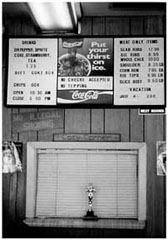 DR: ‘Come on in. We’ll be glad to have you.’ [laughs] A lot of times I’ll say that. As a matter of fact, some ladies and a gentleman drove up a few weeks ago around nine o’ clock. Well, we don’t open until ten-thirty and the sign tells that we don’t open until ten-thirty. Well, they didn’t leave. They just stayed there and were getting out of the car. So I went to the door to tell them that we weren’t open. And the man said, ‘Please can we come in. We need to come in. The ladies need to use the restroom.’ And I said, ‘Come on in here.’ And then my son and I were having some appetizers. We did a Townhouse cracker, put some cheese on it, and put it on the pit, put some hot dogs, and cut them, you know, we smoked it first, and cut it and put it on top, and we were eating that. So they came in and we shared it with them and we just had a good time talking. That’s the kind of thing that I want people to feel comfortable and feel at home when they come. Even though we’re not really fast food, so it’ll take a little while for you to get your order… Because every order is fixed individually. We don’t have anything waiting around hot. When you order it is when we heat it.