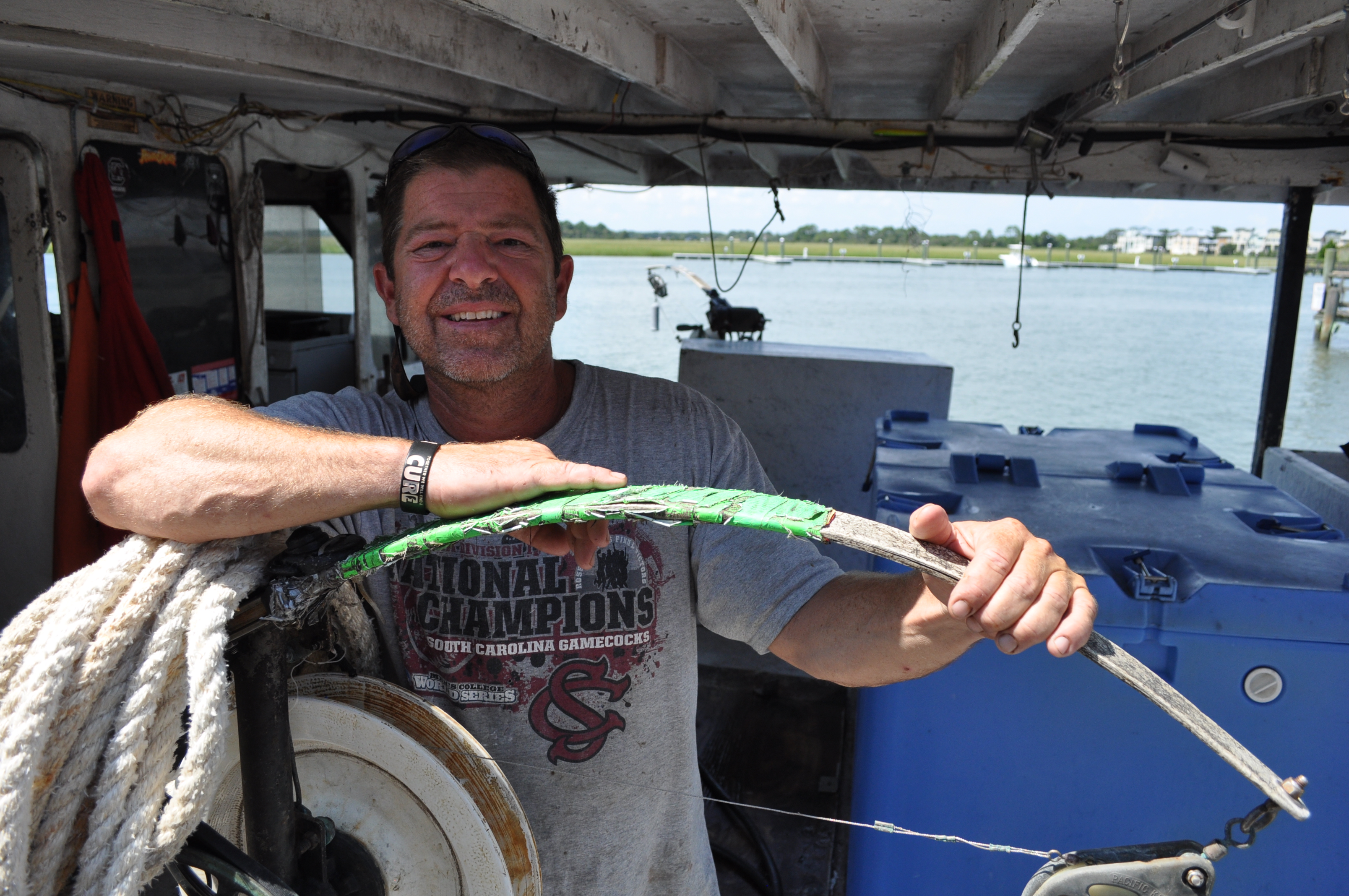 David Thomas has been fishing commercially for the past twenty-five years. He was born and raised in Conway, South Carolina, where his father ran a grocery store. He spent his summers in Ponce Inlet, Florida, where his uncle fished commercially and ran Timmons Fish Camp. David decided the only practical job for him was to fish, but today he say government regulations make his work difficult. He fishes with a standup rod known as a bandit reel, which drops a bungee cord directly into a current using circle hooks, which catch the outside of the fish’s lip. David and his crew set out for all kinds of catch, including grouper, snapper, triggerfish. When he comes back to the dock, he sells his catch to Crosby’s Fish & Shrimp on James Island in Charleston.