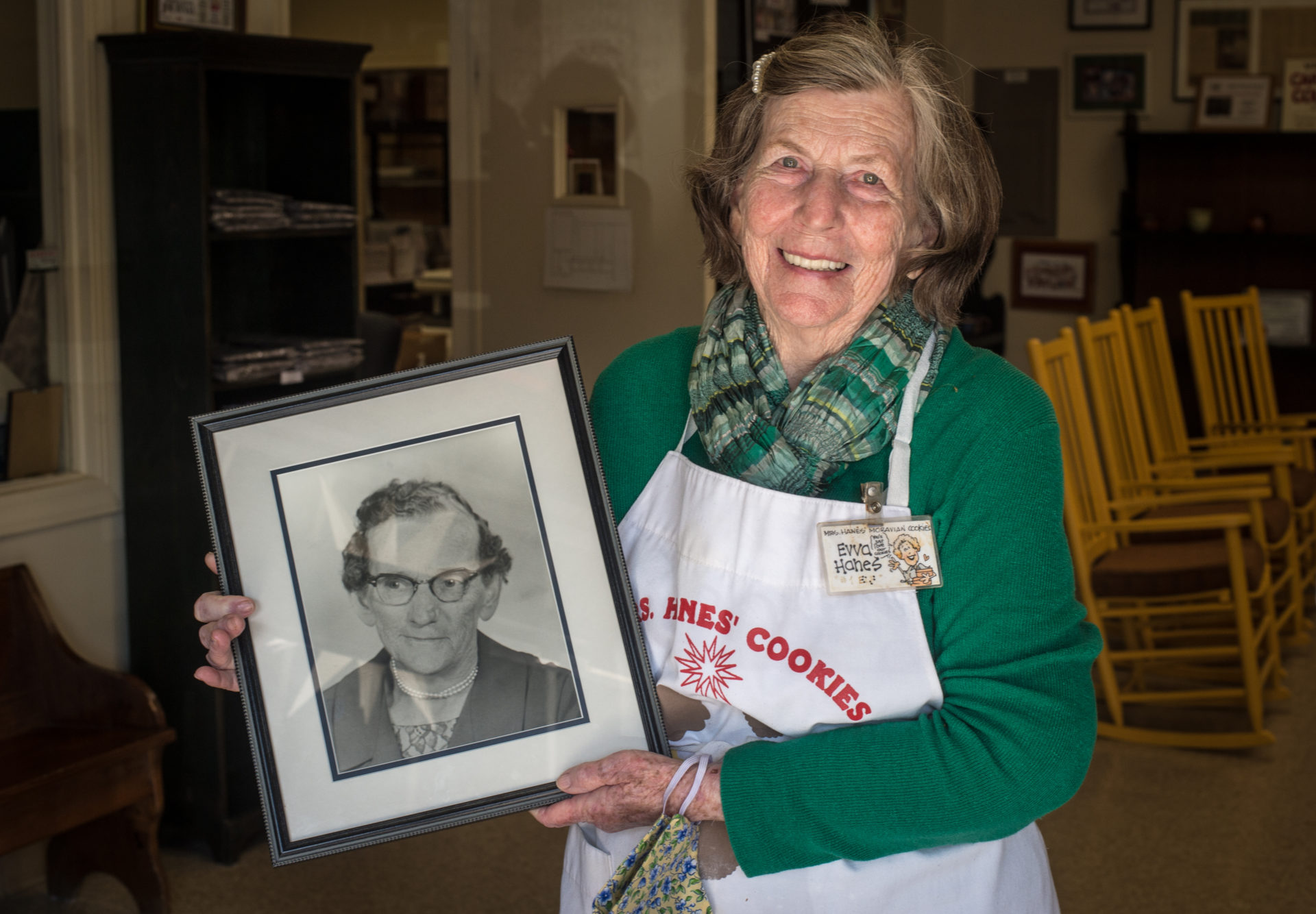 The youngest of seven, Evva Foltz Hanes was born in 1932 in Clemmons, North Carolina in a house that has seen the birth of several generations of the family.  Hanes’ lineage can be traced back to the 1700s, when Moravians settled western North Carolina.  Her father, Alva Foltz was a dairy farmer and her mother, Bertha helped supplement their income making Moravian cookies.  Hanes learned to cook as a child by helping her mother, and later took over the cookie-making in the 1960s, teaching her own children the tradition.