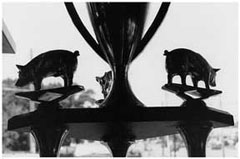 Here at the restaurant we do have a spindle that we cook a whole hog on, but in competition it’s more of a grill with heat that’s cooked to the side. It’s slow and low. And with this one we use electric heat. [She’s referring to the glass-encased pit in the center of the dining room. On the spit above the electric pit is a plaster pig. Painted on the side of the pit are the words ‘Love Me Tenderloin.’] But we use charcoal and hickory chips. But we do whole hog, and that is as much in the taste of the pork, but also it’s presentation. When you open him up and you look at the pig he should be beautiful and brown and nice and have an absolutely gorgeous presentation to him along with the meat having not so much a pork flavor, but a very unique individual flavor. Because pork tastes like pork, but most everybody seasons it with garlic and apple juices and different types of marinade to give it a different kick or flavor. So, that’s what we do with ours also.