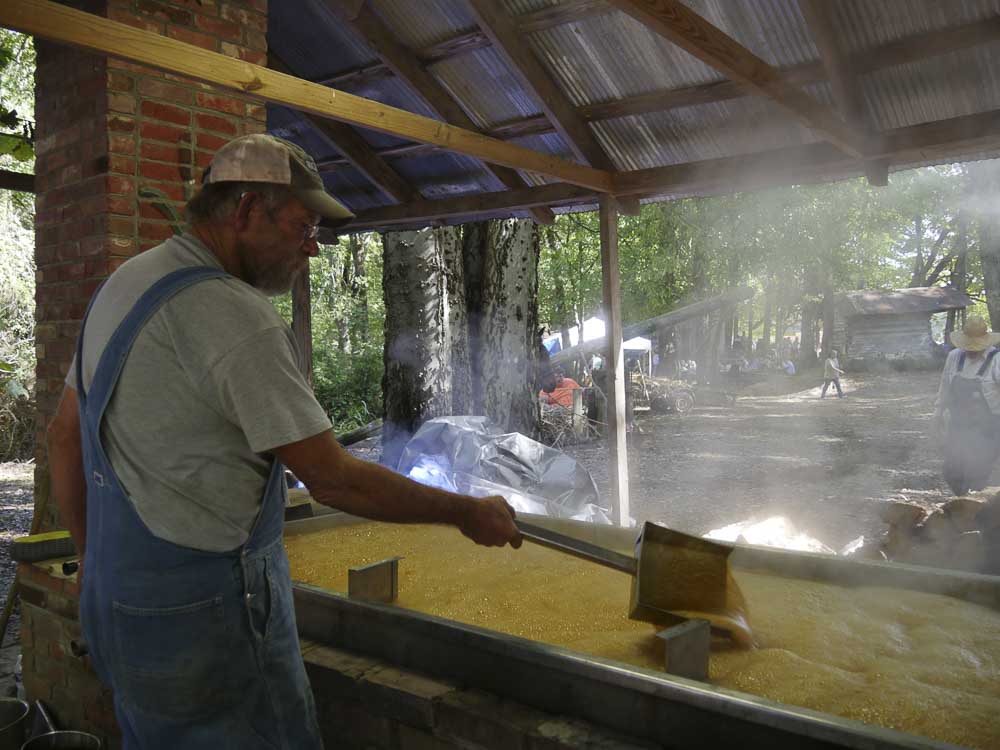 He and his wife, Teresa, showcase the process of cooking sorghum to the public at their annual event, Parker Homestead Days. Every fall, hundreds of people come to Whitehall to tour the Parkers’ reconstructed cabins and see Mr. Parker cook sorghum. Vendors set up food stalls and craft demonstrations. The highlight of each homestead day is Mr. Parker’s stall where he cooks sorghum over a wood-fired pit.