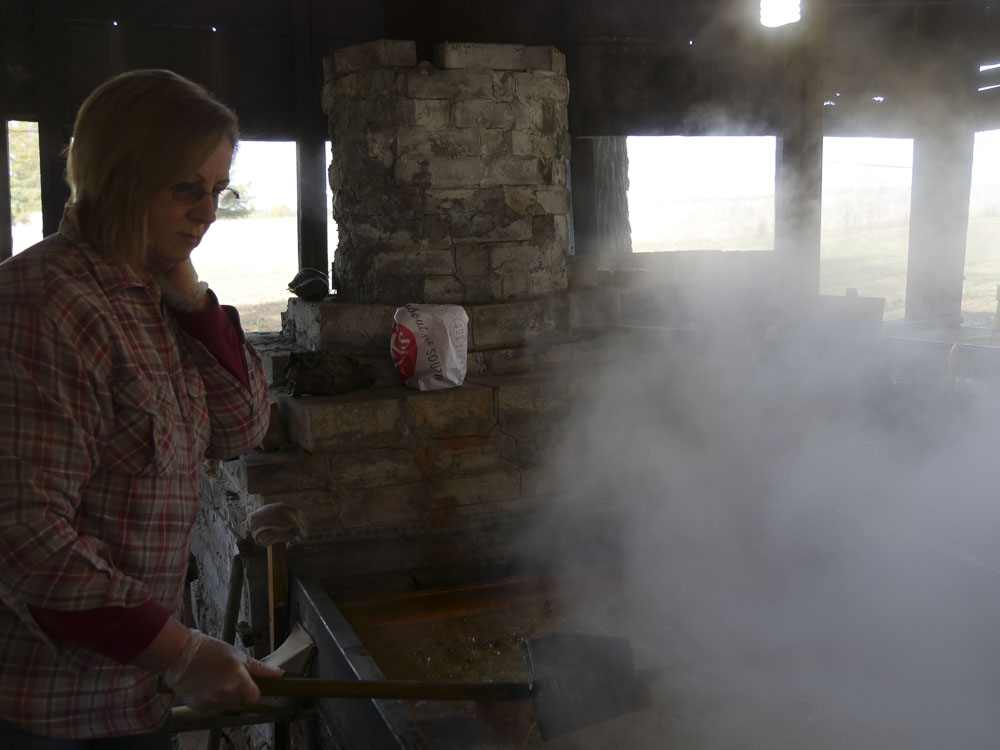 After Renee married Kenneth Goss, she began helping his family harvest and cook sorghum. Throughout the years, she learned the art of cooking sorghum juice into a viscous golden syrup from watching Mr. L.D and Mrs. Willodean. Goss mans the sorghum pan and sells pints and quarts of syrup to community members who stop by their sorghum shed.