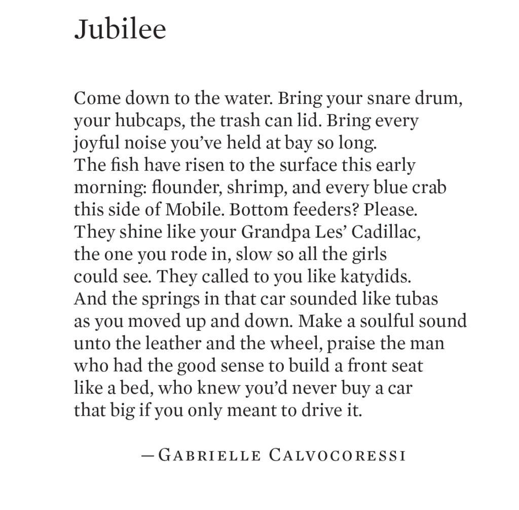 “Jubilee,” from Apocalyptic Swing. Copyright © by Gabrielle Calvocoressi. Reprinted with the permission of Persea Books, New York. All rights reserved.