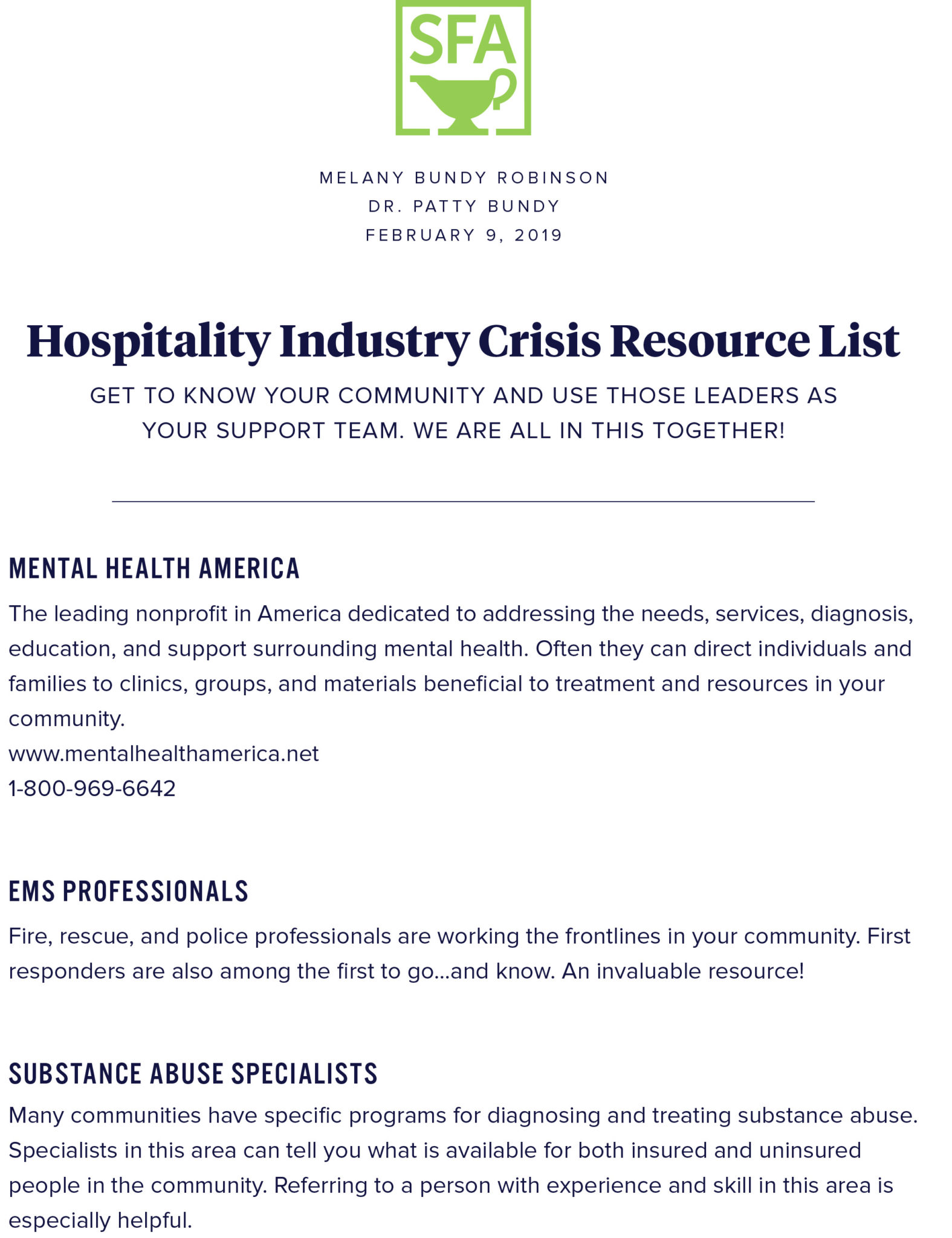 At our 2019 Winter Symposium, Dr. Patricia Bundy and Melany Bundy Robinson discussed crises in the hospitality industry. They developed this resource list for industry professionals who seek to prepare for, respond to, learn from, and prevent crises. Print the .pdf here.