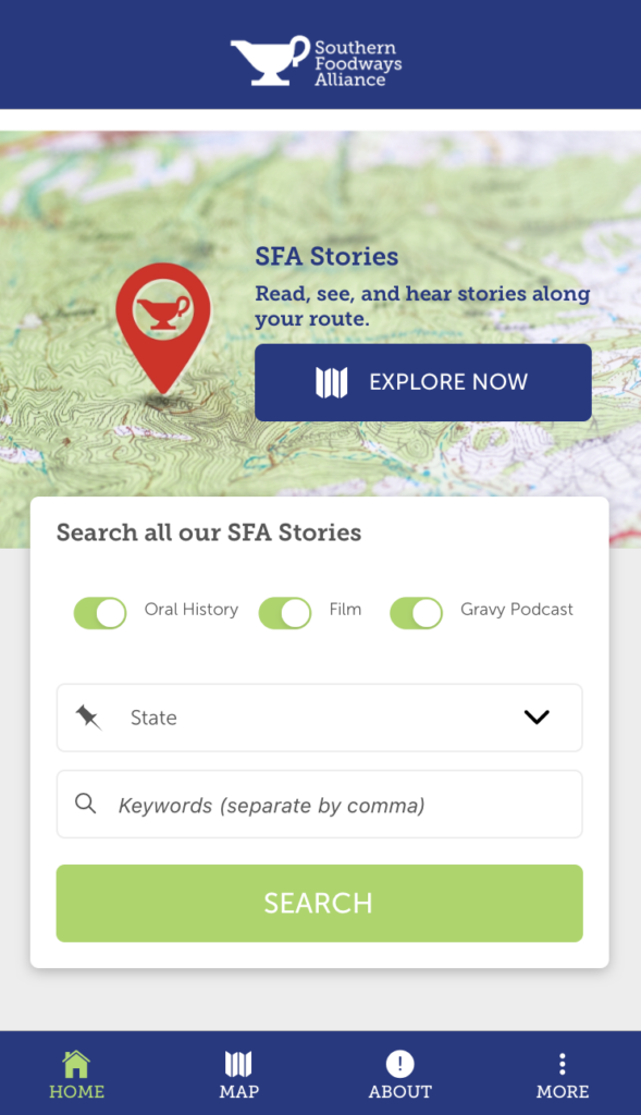 The Southern Foodways Alliance is proud to share SFA Stories, an app that shares our documentary work—film, oral history, and podcasts. Use the map to plan a road trip, or search by keyword to see all the SFA content on that subject.