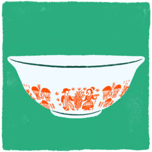 In one knee-high cabinet across from my kitchen sink, my mother’s butterprint Pyrex sits on call. It held the batter for my ninth birthday cake, with aqua-blue icing and cowboy-themed hard-candy studded on top. That bowl survived sixty years intact when nothing else could. Now it helps when I get the urge to roll out Finnish korvapuusti or to mix a white box cake for a berry trifle. I can lift out the big bowl and be small again.