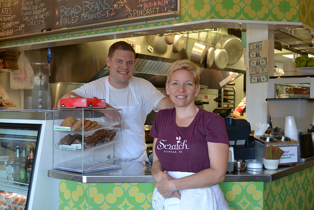 So what does a typical day at the CFM look like? On Saturdays you can stop by the Eco Farm stand to chat with John Soehner and Cindy Econopouly Soehner and learn about the shiitake mushrooms they cultivate on their farm in Chapel Hill. Then you stroll over to the Peregrine Farm stand and admire Betsy Hitt’s flowers or enter into a conversation with Alex Hitt as he roasts peppers on an open flame. You can grab a slice of Louise Parrish’s famous pound cake to go, or stop by the Pig restaurant’s cart to get an Animal Welfare Approved pork hotdog on a Chicken Bridge Bakery bun.  If you keep an eye open, you will likely see many of Durham, Chapel Hill, and Carrboro’s chefs such as Karen and Ben Barker of Magnolia Grill, Bill Smith of Crook’s Corner, or Matt and Sheila Neal of Neal’s Deli sourcing local ingredients to feature on their menus. And you are more than likely to receive a warm and welcoming smile from the current market manager, Sarah Blacklin, who has fostered the market’s involvement in community outreach and food education.