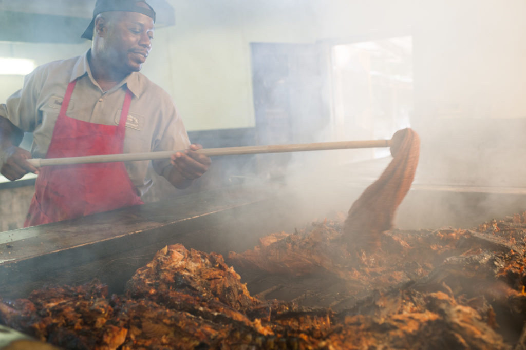 Since elementary school, Rodney Scott has worked in the family business, feeding logs of hardwood into burn barrels to make coals over which whole hogs roast for 12 hours or more.